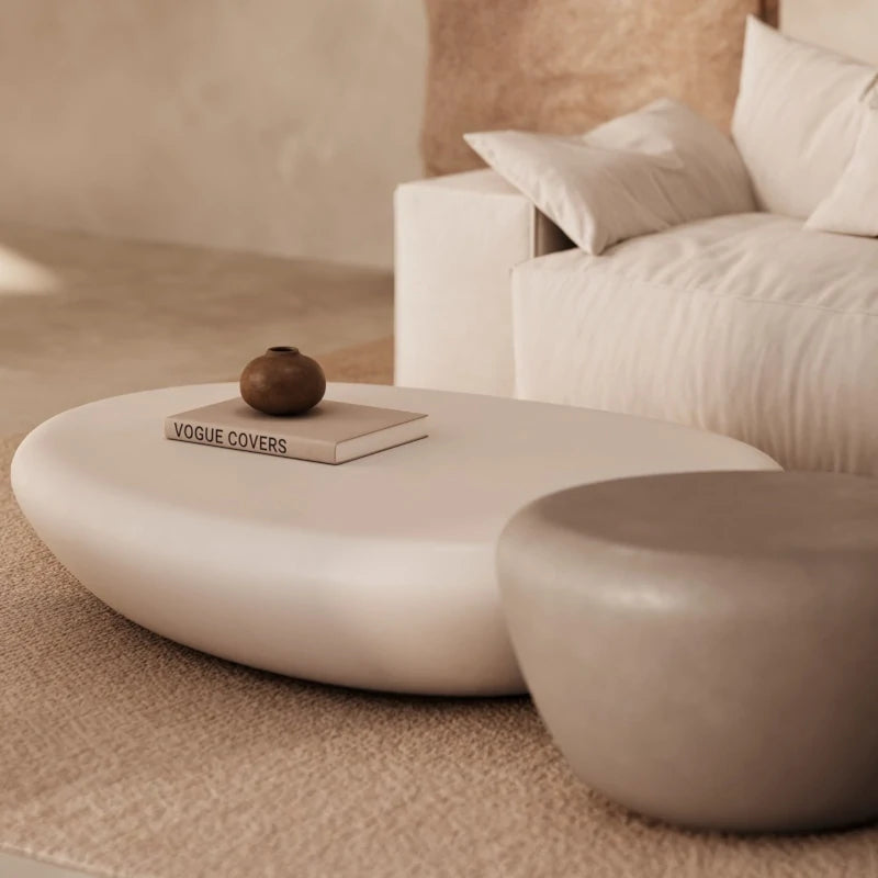 The Oasis tables bring microcement to its most inviting form: soft volumes, rounded edges, and a matte finish that serenely captures the light. Like pebbles polished by the sea, they blend seamlessly into the living room with a quiet and elegant presence.