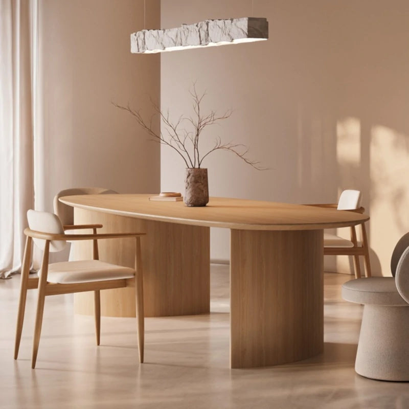 The Brisa table anchors the space with a natural serenity. Its soft silhouette and sculptural pedestals allow light to glide along the grain, like a warm breeze sweeping through the room. The wood, in its most honest tone, brings that timeless feeling of home: a pleasant touch, visual balance, and a presence that invites conversation.