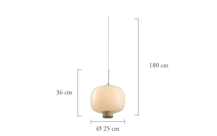 In terms of proportions, its scale is perfect for domestic spaces: the body describesø25 cmand36 cmin height, with a total development of the set ofup to 180 cmFrom the ceiling, allowing it to be installed at the appropriate height above round or rectangular tables.E27 socket,220–240 V,50–60 Hz,IP20andnot adjustable, awarm LED bulb (2700–3000 K)Made of opal glass for a uniform and comfortable light emission for hours. The weight of the piece is2 kgand the packing volume of0.06 m³, data that facilitates planning installation and logistics on site.