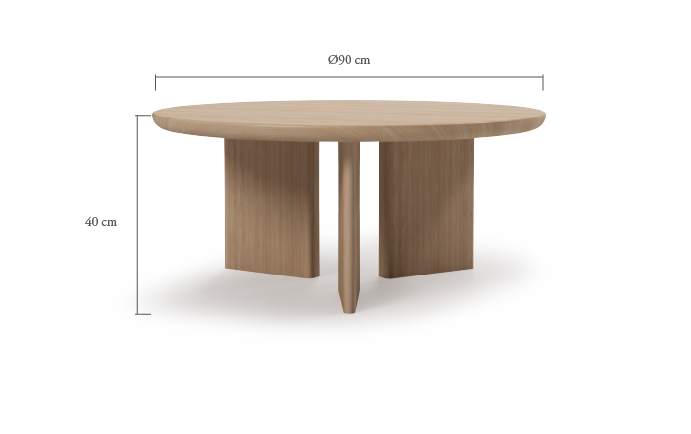 The Zen solid wood coffee table exudes serenity. Available in natural oak or dark walnut, its Ø90 cm top rests on slender legs that enhance its visual lightness.