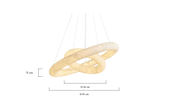 La suspension Halo Duo est une composition sculpturale d'anneaux entrelacés qui créent un effet visuel dynamique et organique. Ses volumes continus s'entrecroisent naturellement, créant une pièce pleine de mouvement et de profondeur qui semble flotter dans l'air grâce à ses câbles de suspension fins et discrets, contribuant à une sensation de légèreté absolue. Fabriquée en soie naturelle, la matière translucide filtre la lumière de façon chaleureuse et enveloppante.