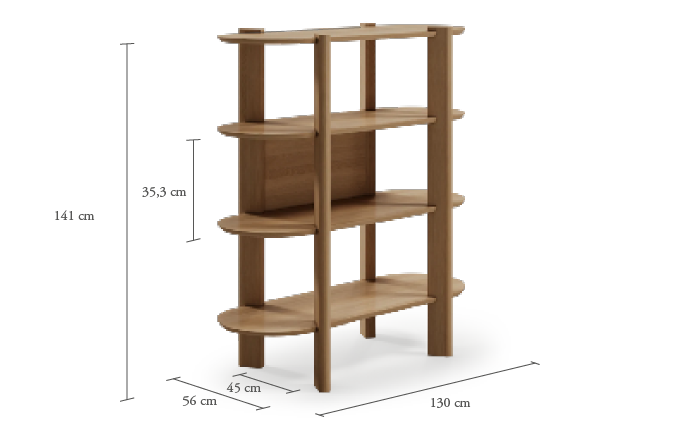 La estantería mide 130 cm de ancho, 56 cm de profundo y 141 cm de alto, lo que genera un mueble de proporciones cómodas y elegantes para cualquier salón, despacho o recibidor. Fabricada en dos acabados, roble y nogal, con vetas visibles y cantos chapados lo que aporta calidez y elegancia del conjunto , siendo una composición sólida y estable capaz de funcionar como pieza protagonista en una pared libre o como añadido en cualquier conjunto de diseño.