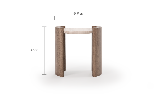 Volga es una mesa auxiliar que equilibra ligereza visual y peso mineral. Su tapa de mármol travertino descansa sobre un juego de patas arqueadas en madera una base esbelta y estable que deja respirar el entorno, creando un punto de apoyo cómodo junto al sofá, entre butacas o a pie de cama. La lectura es serena: reduce el ruido visual y centra la mirada en lo esencial, ese gesto cotidiano de dejar un libro, una vela o el café.