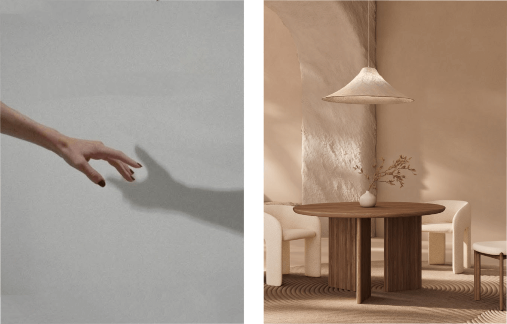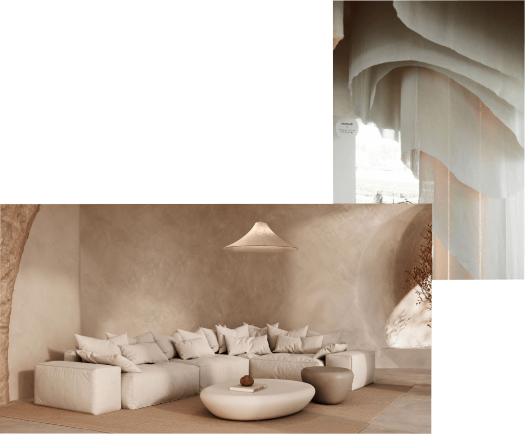 Los materiales protagonistas son el microcemento, la madera natural y los tejidos orgánicos. El lenguaje visual es contenido, equilibrado, atemporal. Las piezas dialogan con el vacío y con la luz, configurando escenas que transmiten paz sin perder sofisticación.